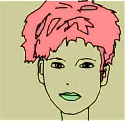 мужскую шляпу, парик и очки; ее красные волосы рассыпаются по плечам. Марк
